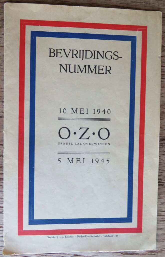 Vervuld van diepe innerlijke vreugde en dankbaarheid om de bevrijding, die… zolang met spanning verwacht… toch nog plotseling over ons kwam, bieden wij u bij deze het bevrijdingsnummer van O.Z.O.( Oranje Zal Overwinnen) aan. Hoe hebben wij gehunkerd naar dit ogenblik.