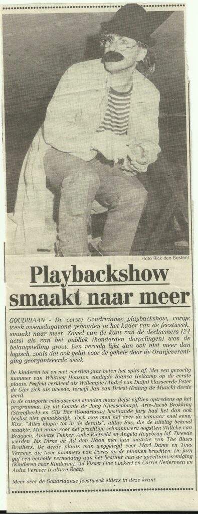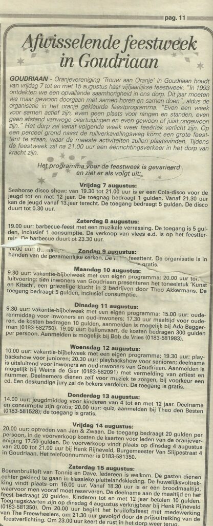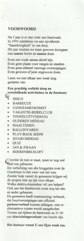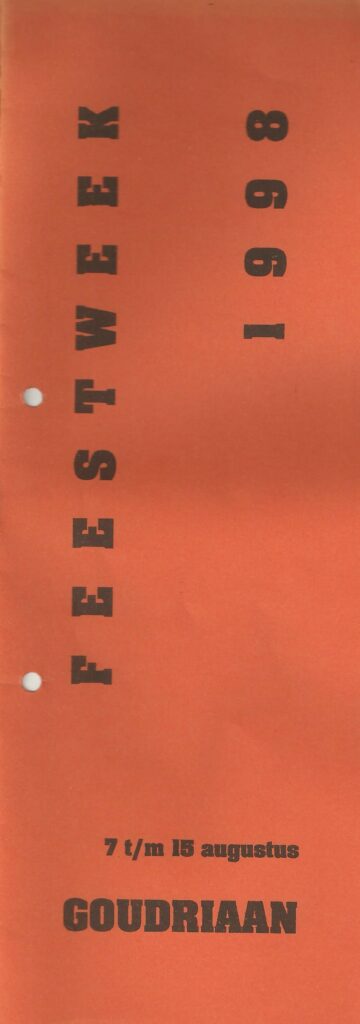 Hoe ging het vroeger aan toe in Goudriaan? We hebben ons archief doorgespit en hebben een aantal programmaboekjes of -flyers gevonden. Deze delen we graag met jullie! Het gaat om de feestweken van 1993 en 1998.